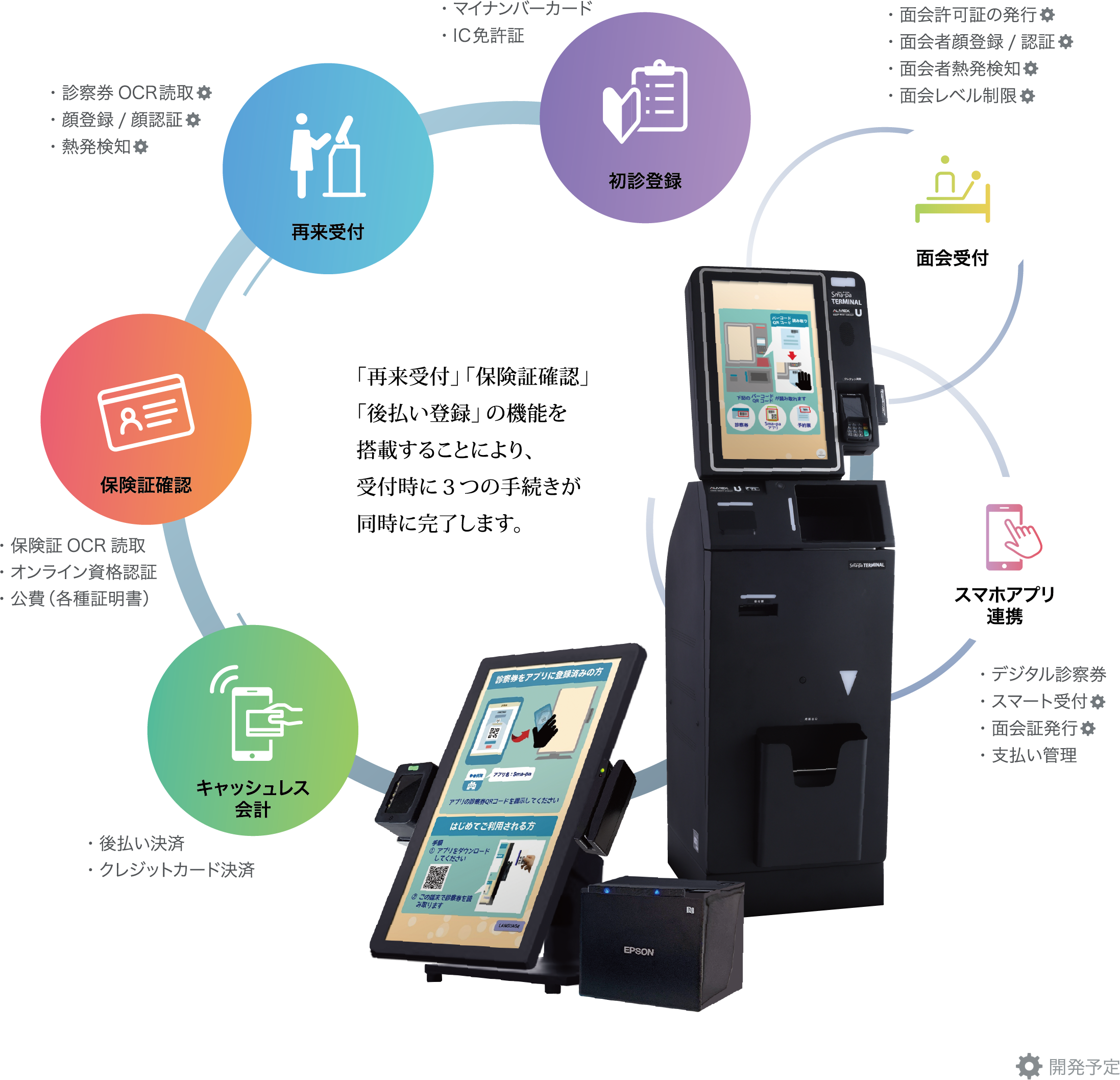 Sma-pa TERMINALは、医療機関向けの窓口業務支援システムです。顔認証による再来受付、マイナンバーカードや免許証、在留カードなどのIC読取りによる本人確認・初診登録、キャッシュレス会計(後払い、クレジットカード、交通系ICカード、QRコードなど各種決済)に対応。感染病対策としてサーモカメラによる熱発検知機能も開発予定で、医療機関の窓口業務を効率化し、患者とスタッフの利便性を高めます。