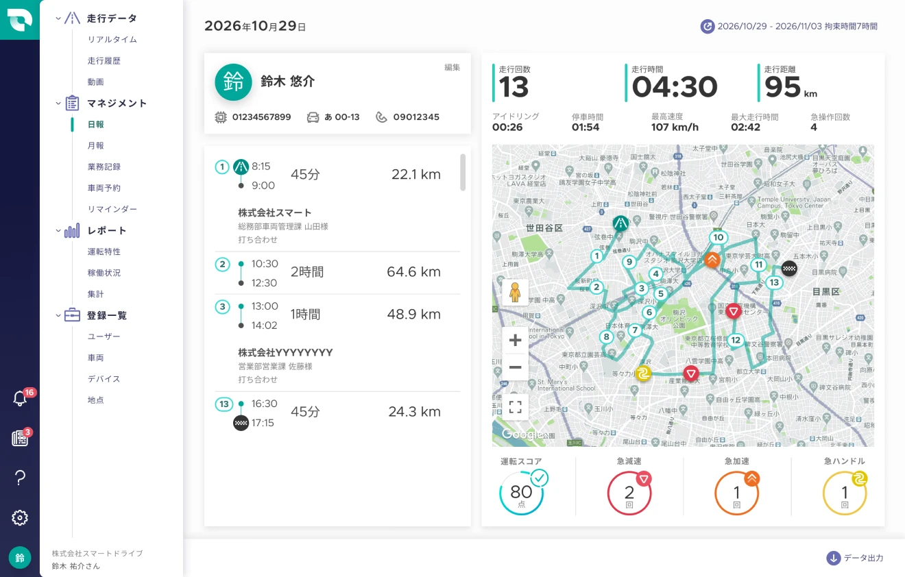 SmartDrive Fleetは、車両の位置情報やコスト管理を一元化するクラウド型車両管理システムです。シガーソケットに挿すだけのデバイスで走行データを自動収集し、リアルタイム位置情報、走行履歴、安全運転診断、運転日報・月報などの機能を提供。直感的な操作性と洗練されたデザインで、多くの業種・業態に対応します。コスト削減、コンプライアンス強化、安全運転の強化など、車両管理に関するさまざまな課題を解決します。