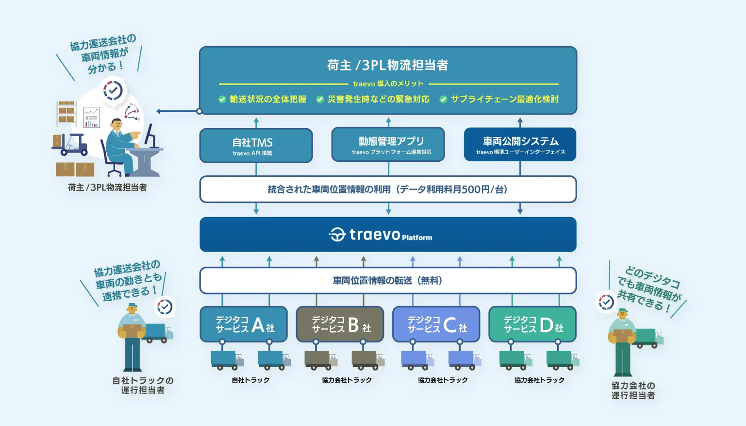 traevoは、主要デジタコサービスとのデータ連携を可能にし、車両動態管理の一元化を実現します。車両情報のデータ利用料は車両1台あたり月額500円(税抜)とリーズナブルで、複数のシステムを使いこなす必要がなくなります。