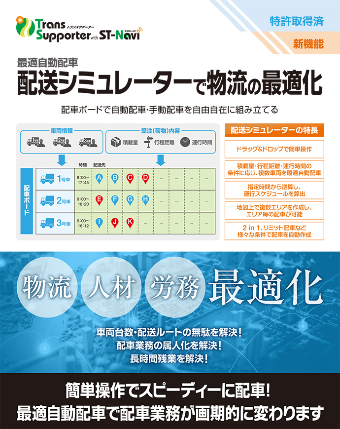 Trans Supporterは、配送業務の効率化を実現する運行支援システムです。自動配車機能、運行ルートの最適化、運行管理、経費管理システムなどを搭載。ドライバーの動態管理、配送ルートの最適化、配送時間の見える化、収支の見える化を実現し、配送コストの削減と顧客満足度の向上をサポートします。Android端末とGPSを利用し、配送業務のムダを削減し、効率的な配車支援を提供します。