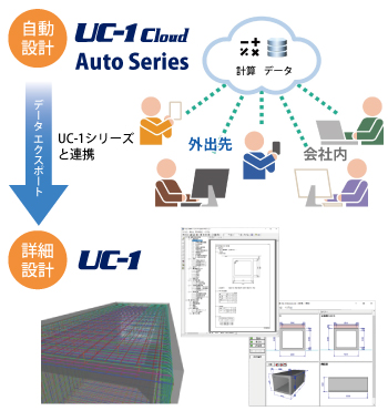 UC-1 Cloud 自動設計 BOXカルバート Ver.2は、「BOXカルバートの設計・3D配筋」との連携が可能。詳細設計や計算書、図面の出力を行い、設計の効率化と精度向上を実現します。