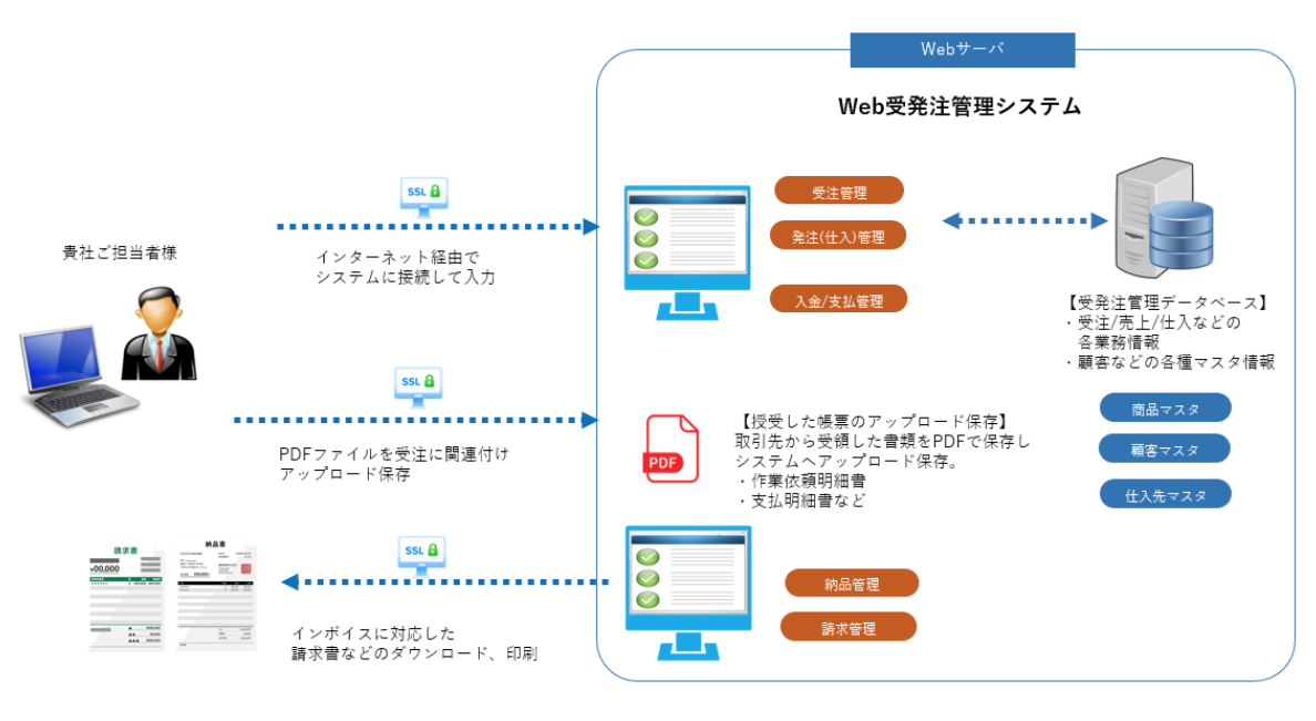 クライアントアプリが不要で、コスト削減とシステム運用の効率化を実現します。インボイス制度に対応した帳票出力機能も備えています。