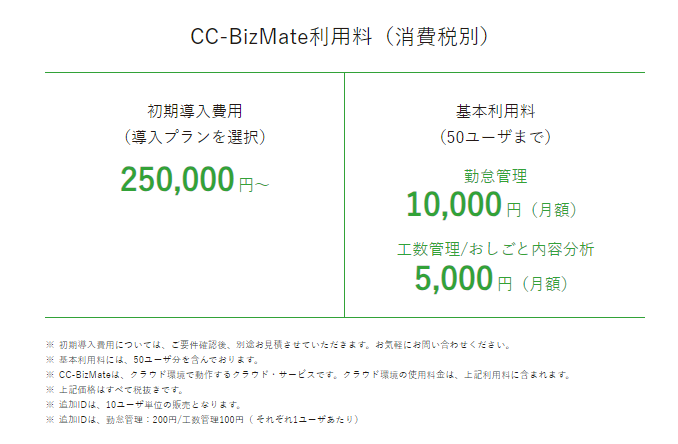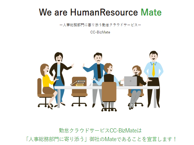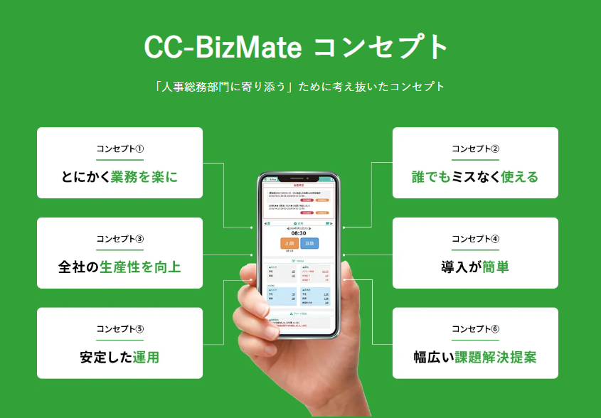 CC-BizMateは、人事総務部門に寄り添う勤怠管理クラウドサービスです。安否確認機能標準搭載で、継続利用率98.9%を誇ります。月額費用は一人200円からで、テレワーク利用実績も多数あります。