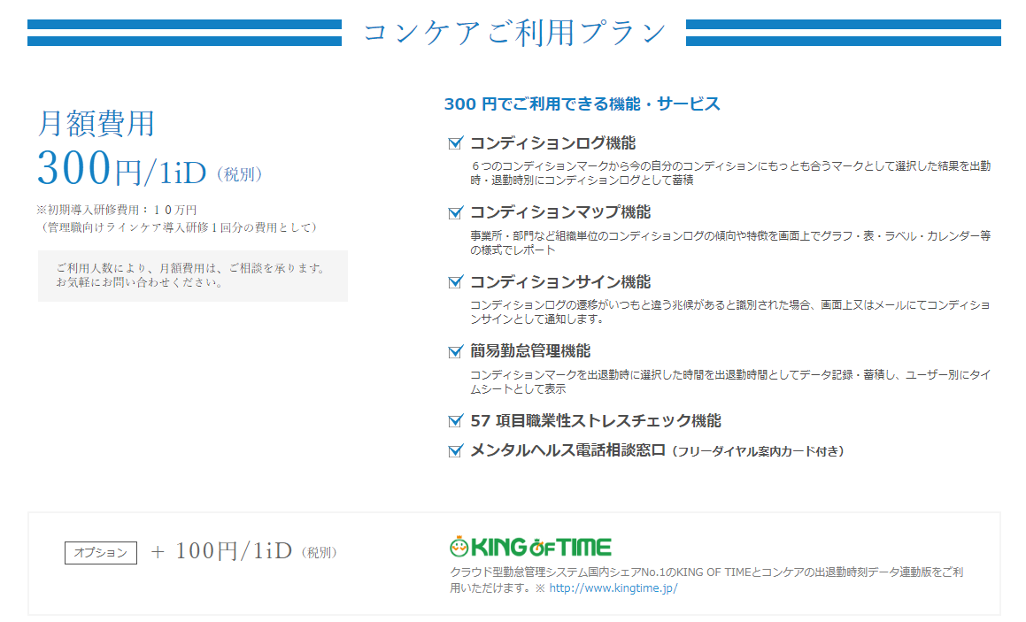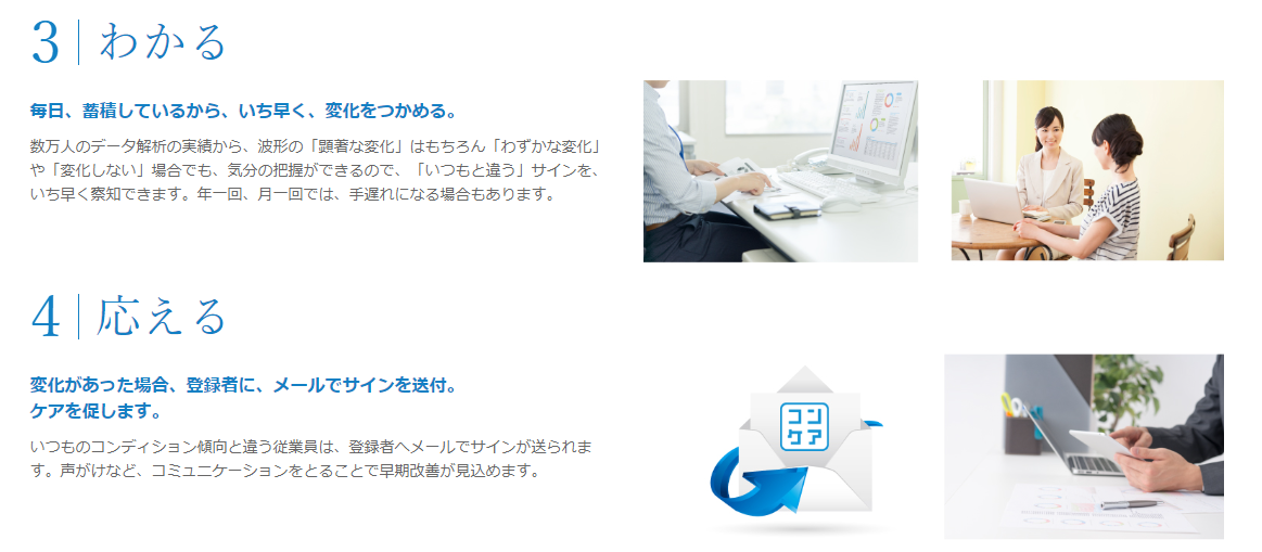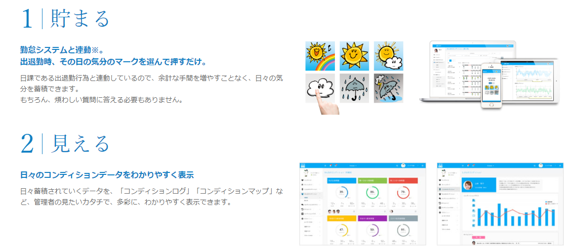 コンケアは、こころの新習慣でメンタル離職・不調を早期に予防する、新発想の労務管理ツールです。出退勤時、その日の気分にあったお天気マークを押すだけで、日々のコンディションを見える化して蓄積します。