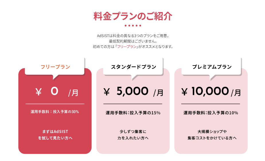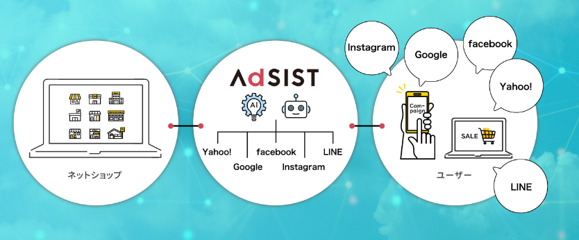 AdSISTは専門的な知識がなくても登録されている商品データを自動で取り込み、Instagram、facebook、Yahoo!、 Google、LINEを通じて集客できる売上UP支援ツールです。最低1,000円から利用できて、停止はいつでも可能なので初めてのWEB広告におすすめです。