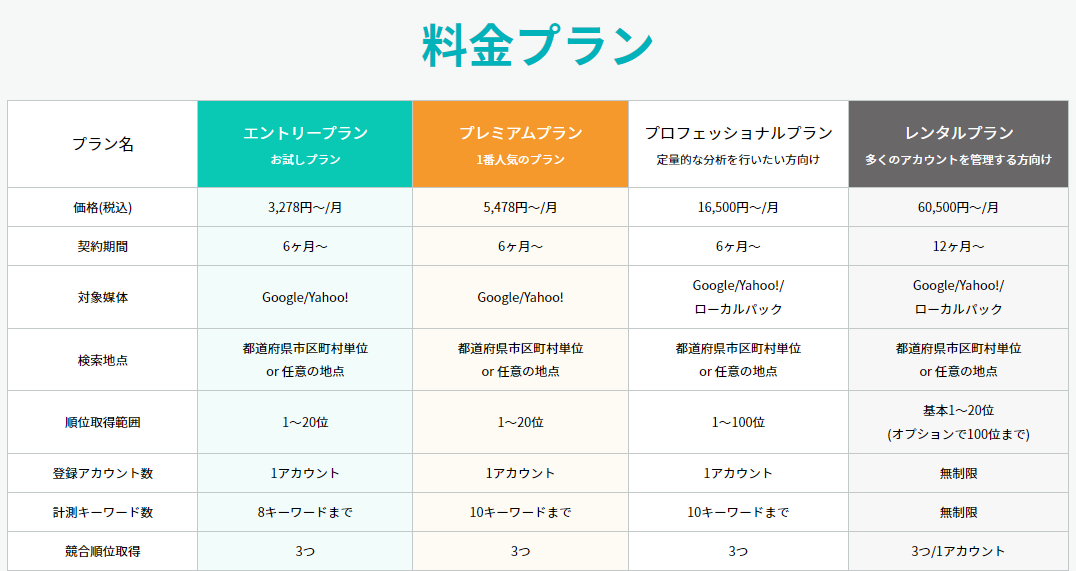 エントリープラン: 3,278円/月、プレミアムプラン: 5,478円/月、プロフェッショナルプラン: 16,500円/月、レンタルプラン: 60,500円/月