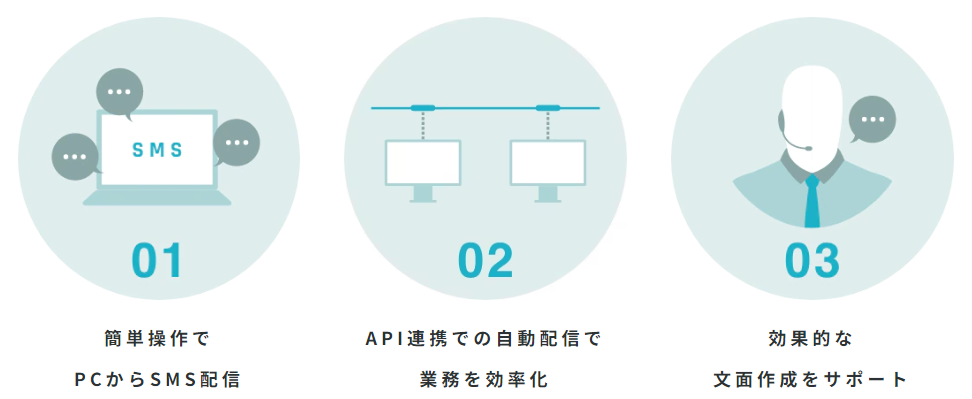 SMSの個別配信・同時配信が、PCでの操作だけで実現できます。API連携での自動配信で業務を効率化貴社で活用されている顧客管理システムやアプリケーションと連携できます。効果的な文面作成をサポート限られた文字数でもコンタクト率向上が期待できる効果的なメッセージを作成します。