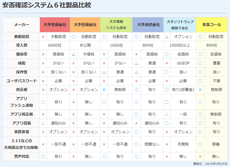 安否コールは、他の5社の安否確認システムと比較しても、自動配信機能、価格帯、機能、操作性、ユーザパスワードの不要性、掲示板、アプリのプッシュ通知、アプリ回答、家族安否、大規模災害での稼働などの観点から優れています。
