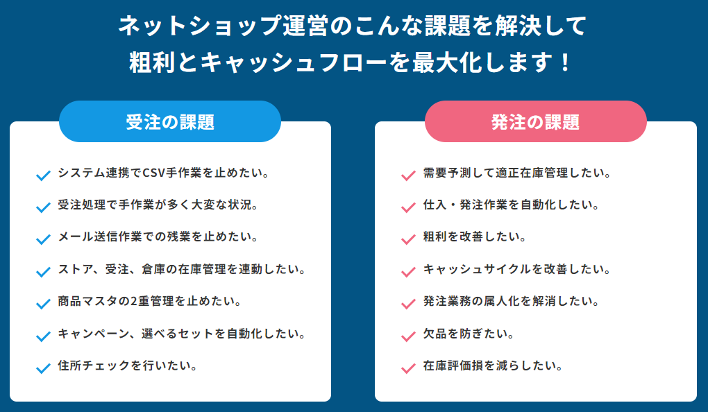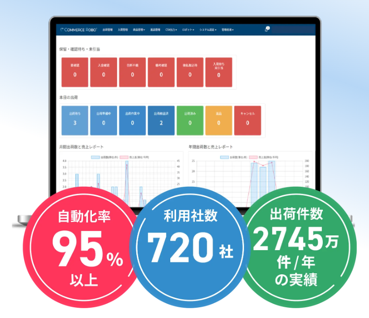 コマースロボはEコマース(EC運営)における受注処理を自動化し、粗利を増やして、在庫運用効率を上げ、売上・粗利・キャッシュフローを最大化するSaaSサービスです。受注処理の課題を解決し、在庫運用効率の課題を解決します。具体的には、WMSデータを自動取得して、需要予測分析を行い在庫日数を計算して、推奨発注量、タイミングの発注支援データを作成します。それにより機会損失を解消することで在庫の運用効率を上げ、売上・粗利・キャッシュフローを最大化します。