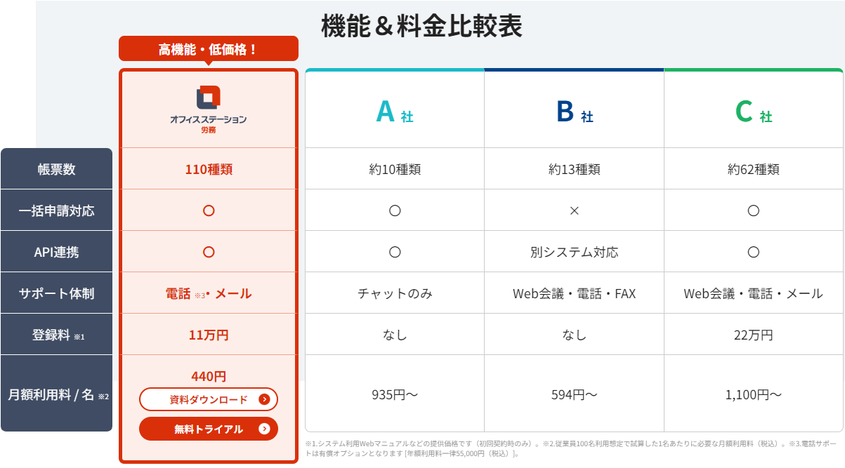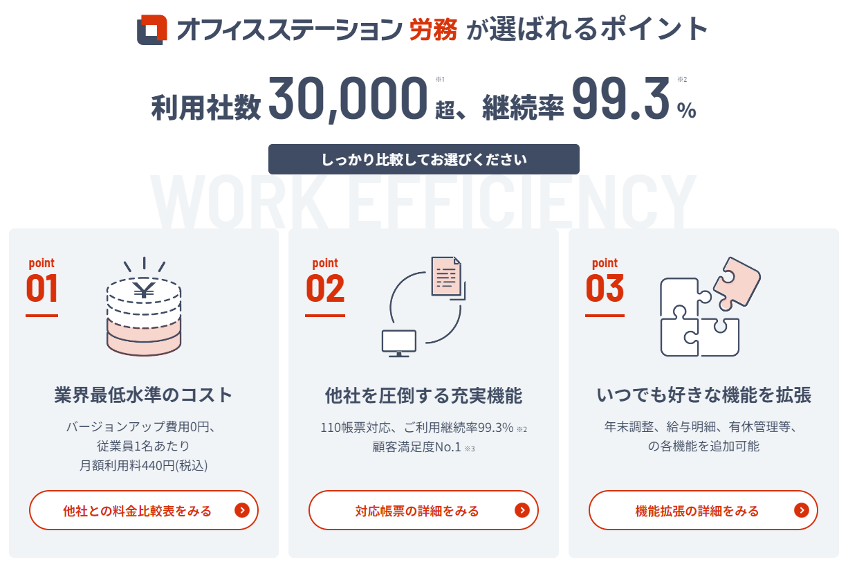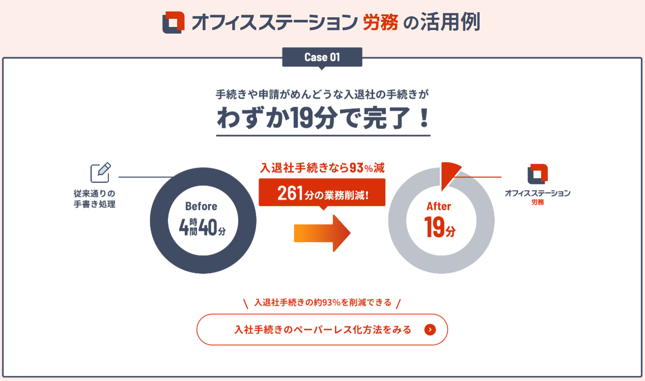 オフィスステーションは、労務管理を効率化するための多機能ツールです。社会保険・労働保険の手続き業務を簡単操作で効率的に完了させることができます。また、有給休暇の管理や年末調整、マイナンバーの取得から廃棄までの管理など、企業側の対応が必要な項目を網羅した便利機能を搭載しています。