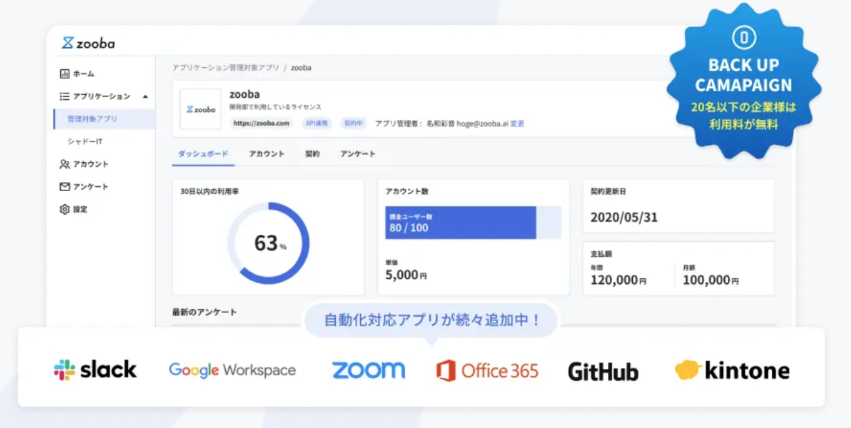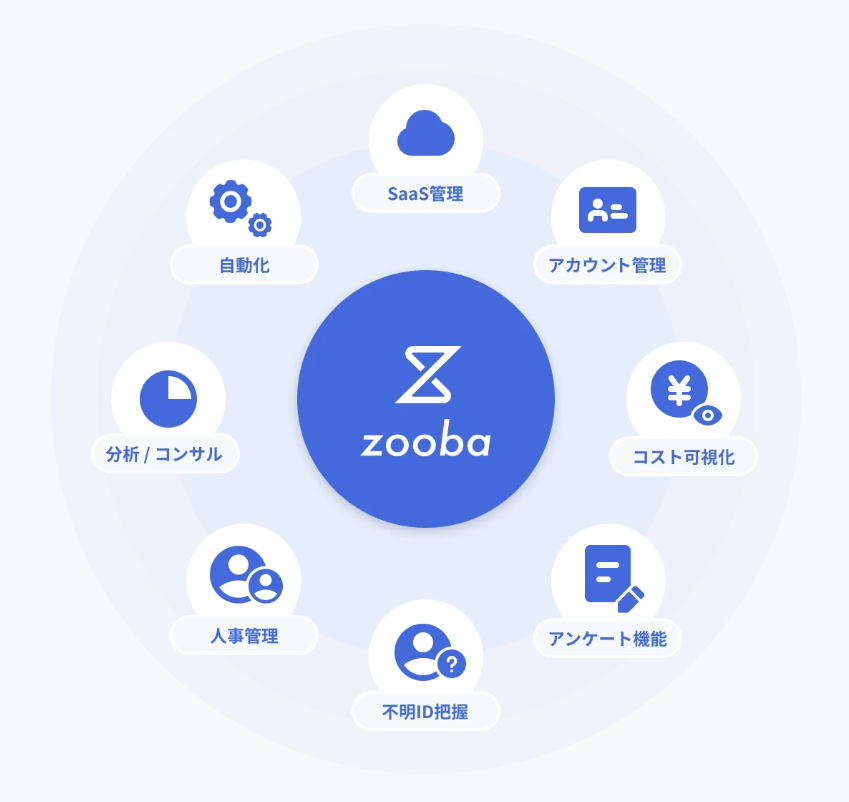zoobaは、情報システム部門を支援するクラウドサービスで、散らばったライセンスを一括管理し、運用コストとライセンスコストを最適化します。アカウント管理、SaaS間の連携、棚卸し機能、入退職自動化、リスクアラート、ゼロトラスト/運用コンサルティングなどの機能を提供し、SaaS運用の負担を軽減します。