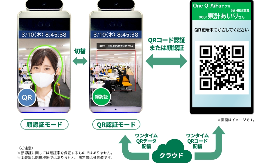 常時ワンタイムQRコードをクラウドで発行し、コピー・カードを渡すなどの不正打刻を防ぎます。顔認証との併用または選択で、完全にICカードを不要に。発行・運用コストをなくします。