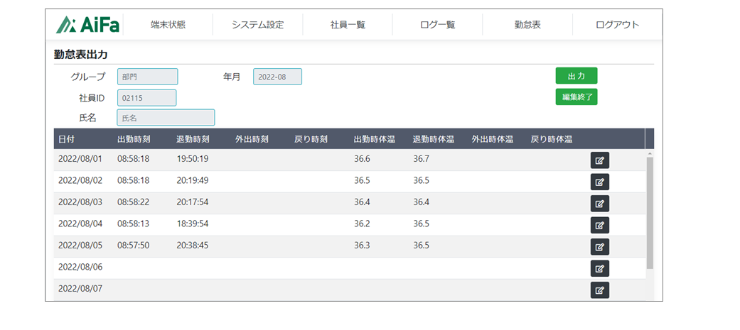 AiFaは、端末の前に立つだけで2秒弱で検温と生体認証を自動的に実施するAI顔認証ソリューションです。勤怠管理、入退出管理、業種別利用シーンなど、様々な場面での利用が可能です。また、他社製品との連携も可能で、低コスト&スピーディな導入が可能です。
