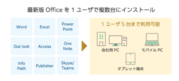 オフィスあんしん365は、最新版のOfficeアプリケーションを1ユーザー5デバイスまで利用可能なサービスです。OneDrive for Businessを活用し、いつでもどこでもOfficeファイルの参照・編集が可能。外出先や共有のパソコンでも利用でき、業務効率が向上します。