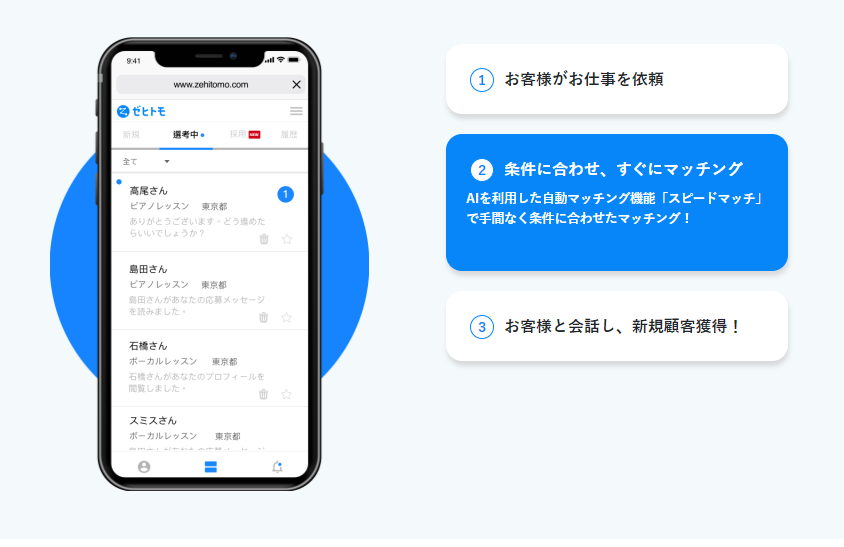 お客様がお仕事を依頼する際、10以上の細かい質問に答え、個人情報まで記入しています。そんな温度感の高いお客様にダイレクトに営業可能です。AIを利用した自動マッチング機能「スピードマッチ」で手間なく条件に合わせたマッチングが可能です。