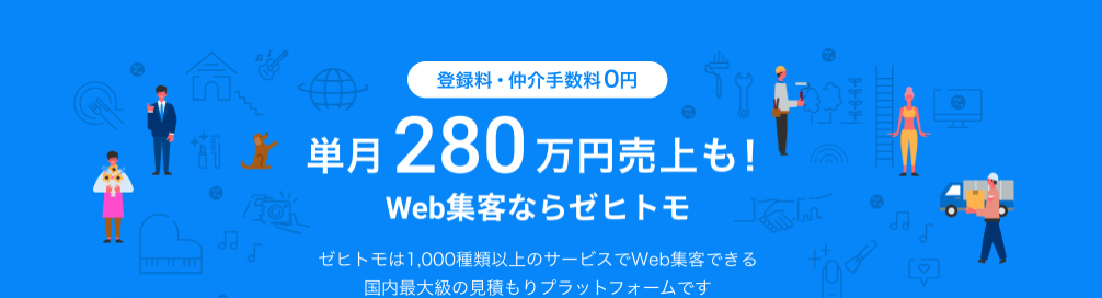 ゼヒトモは、初期登録料、月額利用料、仲介手数料、成約手数料が無料の集客サイトです。毎月約25,000件以上の依頼があり、AIの自動マッチで手間なく集客が可能です。また、充実のサポート体制で初めてのweb集客でも安心して利用できます。