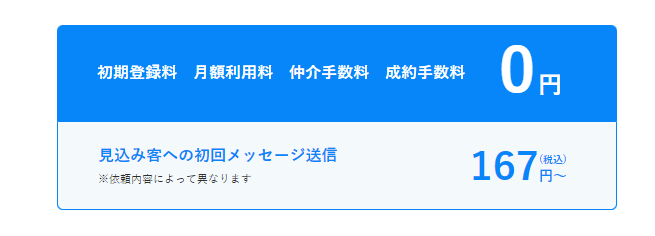 費用は見込み客への初回メッセージ送信のみで、依頼内容によって異なります。初期登録料、月額利用料、仲介手数料、成約手数料は全て0円です。