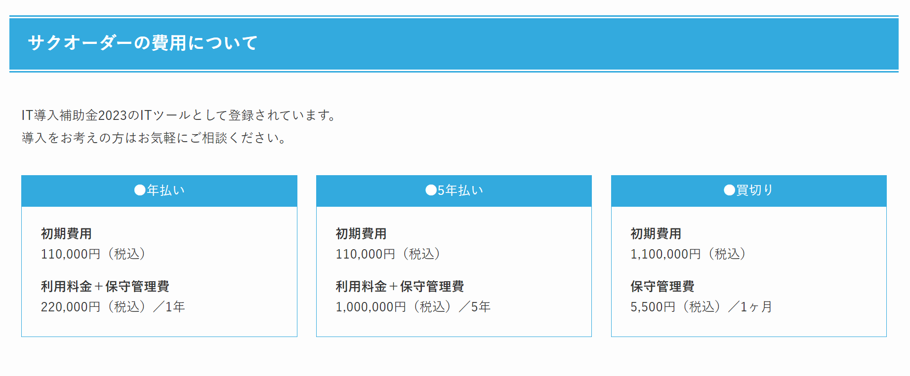 年払い: 初期費用 110,000円(税込)、利用料金+保守管理費 220,000円(税込)/1年; 5年払い: 初期費用 110,000円(税込)、利用料金+保守管理費 1,000,000円(税込)/5年; 買切り: 初期費用 1,100,000円(税込)、保守管理費 5,500円(税込)/1ヶ月
