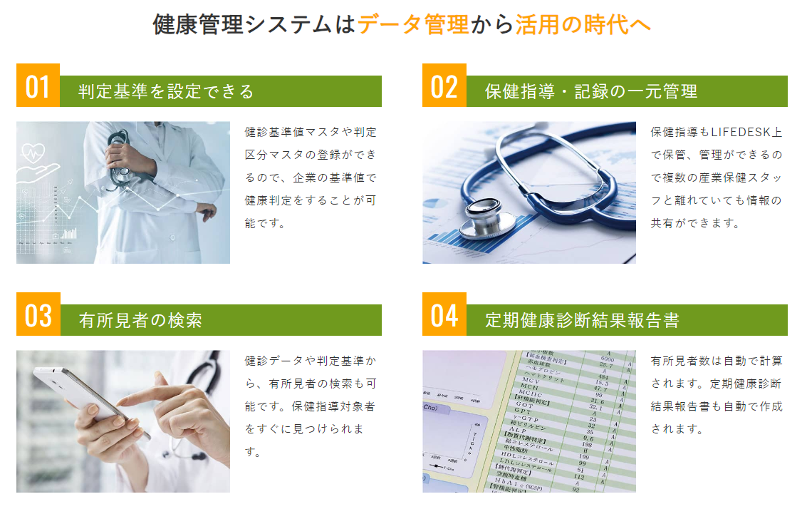 LIFEDESKはクラウド上で従業員の健康データを管理できるので、産業保健スタッフ、および労務管理者が場所を選ばずいつでも従業員の健康状態を確認しサポートすることができます。さらには新たなライフスタイルからなる企業の生産性向上に役立つこと間違いなしです。
