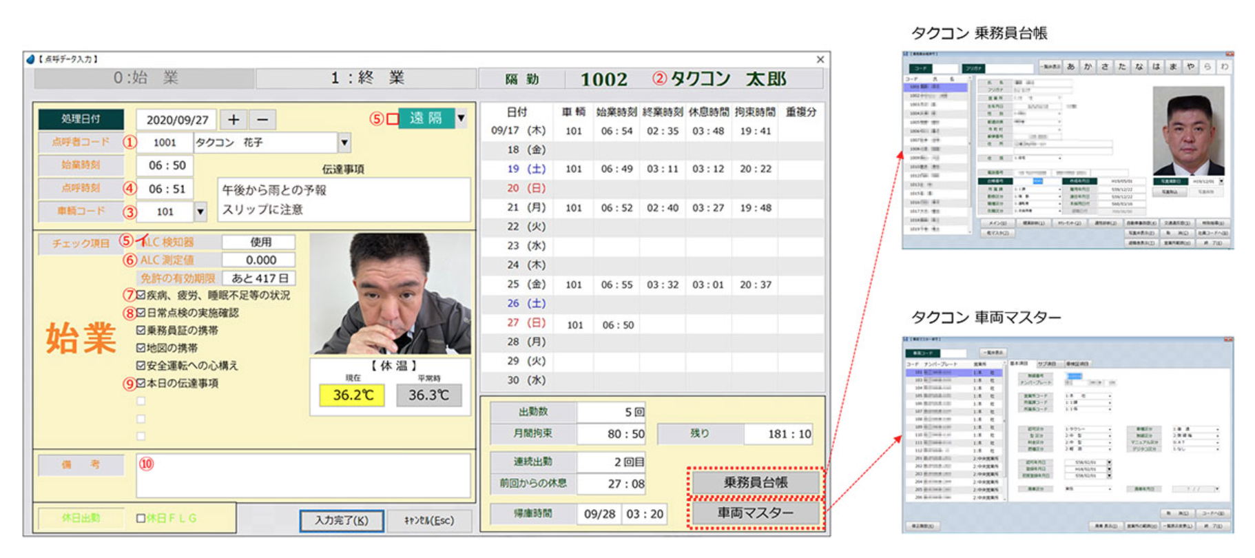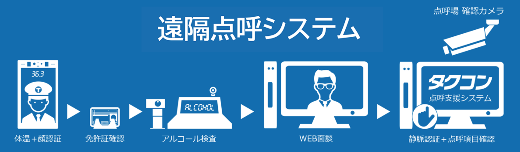 遠隔点呼システムは、タクシー業界向けの点呼支援システムです。顔認証による乗務員本人確認、体温測定による客観的体調確認、免許証リーダーによる免許証保持と有効期限の確認、アルコール検知器による呼気の測定と記録、監視カメラによる点呼場の確認、WEB会議システムによる面談、電子点呼記録及び必要事項の確認、静脈認証による点呼者本人確認などの機能を備えています。これにより、対面点呼に代わる遠隔点呼が実施でき、タクシー業界の業務効率化と安全性向上に貢献します。
