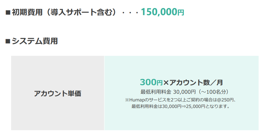 初期費用15万円+300円×ユーザー数/月(最低利用料金30,000円)