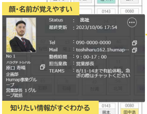 プロフィール表示で、顔と名前を覚えやすく。 テレワークやフリーアドレス、従業員数の増加などによる「名前と顔が一致しない」状況を解決し、コミュニケーション活性化に役立ちます。 プロフィールには、勤務時間や担当業務、スキルのほか、趣味や会社近くのおすすめランチなど、各社ごとに自由に項目設定が可能です。