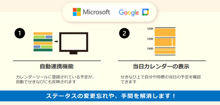 Googleカレンダー/Outlookカレンダーと連携が可能。 カレンダーに登録した時間になると、せきなび上のステータスも自動で変更されます。