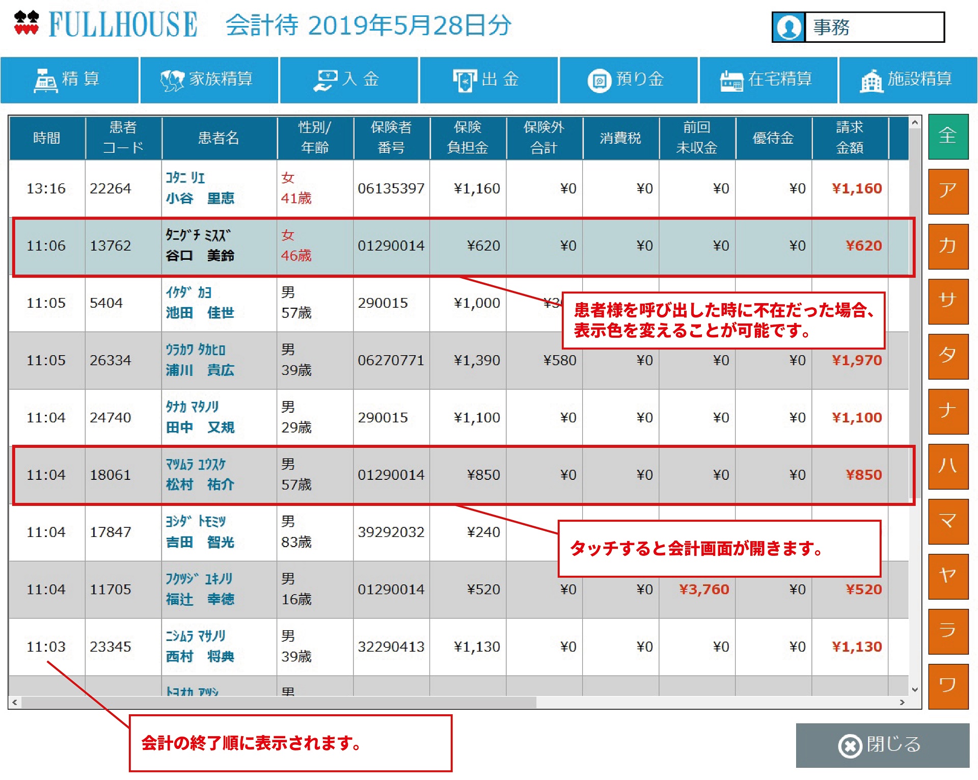 画面タッチ式の入力方法により操作性とスピードが向上し、金額・一部入金処理も可能で、差額分を未収金として記録します。未収金管理画面では、紙ベースで管理していた未収金をパソコンで簡単に管理できます。