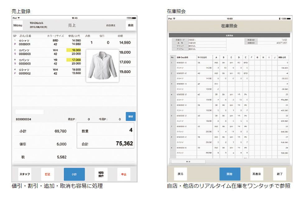 プレゼンPOSは、iPadを活用してアパレル小売店での提案・接客をしながらの販売を可能にするシステムです。商品のコーディネート提案や在庫確認がレジに戻らずに行えます。