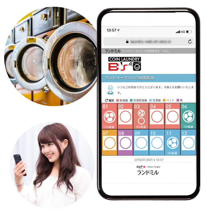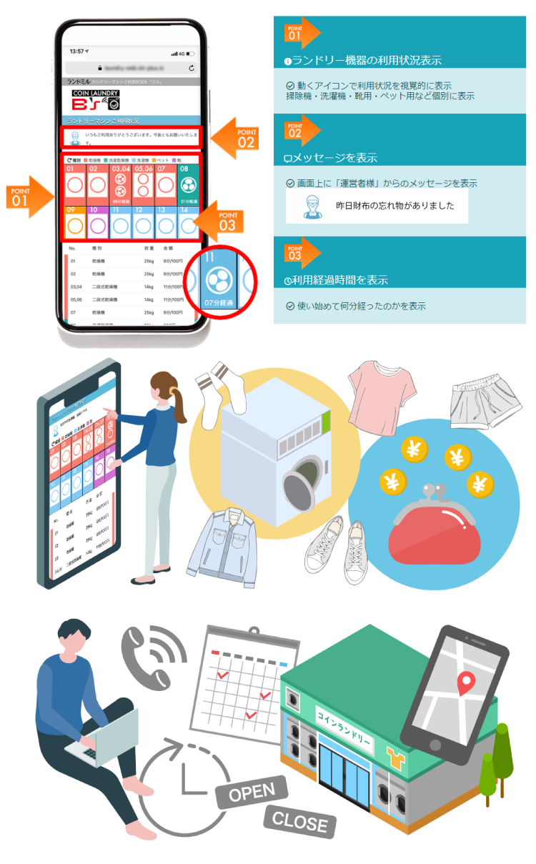 集客アップの起爆剤 ・ランドリー機器の利用状況見える化 ・機器の入れ替え不要なので店舗運営を止めず1日で導入工事が完了 ・来店前に店舗の状況を手軽に確認できます