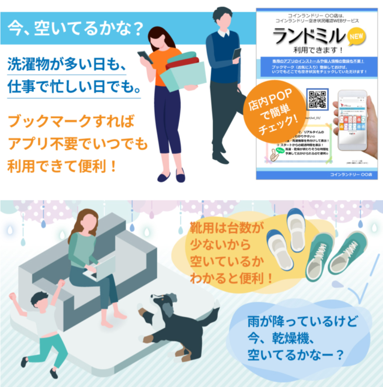 「ランドミル」は、二次元コードで簡単アクセス可能。 専用アプリや会員登録は不要。 店内POPなどのチラシに二次元コードを入れ案内しアクセスしてもらえば、すぐにランドリー機器の利用状況をお見せすることができます。 「ランドミル」をご導入いただくと、ご利用者様がご来店前に分かるといいなと思う情報を手間なく提供することが可能になります。 ブックマーク(お気に入り)登録しておけば、いつでもどこでもご利用いただけます。 ・新規顧客獲得のプロモーションに有効 ・納品時に二次元コード入り案内POPプレゼント! ・顧客満足度向上・リピーター獲得に貢献 ・機会損失の削減に貢献