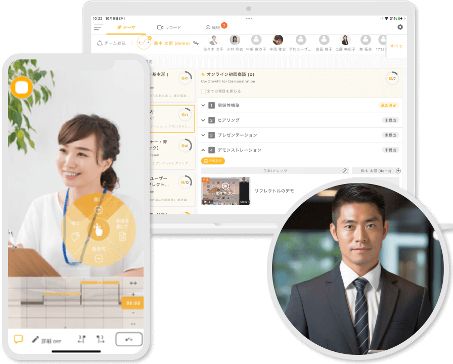 リフレクトルは、営業商談力などのコミュニケーション力の標準モデル化と習得・評価のノウハウをツールに落とし込み、従来よりも高い成果を労力を抑えて実現できます。