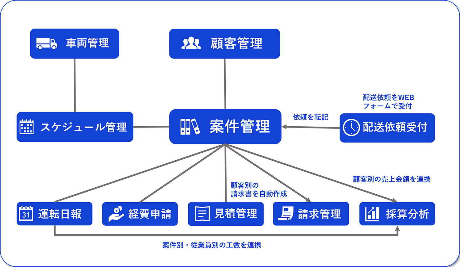 運送業 業務改善パッケージは、運送業・配送業の企業向けのkintoneアプリパッケージです。このシステムは、配車予定の管理、運転日報のリアルタイム入力、請求書作成、車両管理、経費申請など、運送業界でよくある課題を解決します。事務所へ戻らなくてもいつでも・どこでも・最新のスケジュールを確認でき、予定が変更された時やキャンセルになった場合は通知機能で知らせることができます。運転日報をリアルタイムで入力でき、紙やExcelでの二重入力が不要になります。日報に登録された内容をもとに請求書を作成することができ、ドライバーが立て替えた経費はスマホから申請され、月ごとに自動集計されます。車両や従業員別の稼働率をリアルタイムに算出できるため、配送効率を上げるための施策を検討できます。