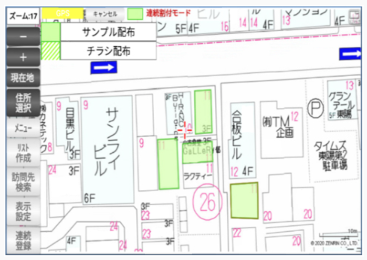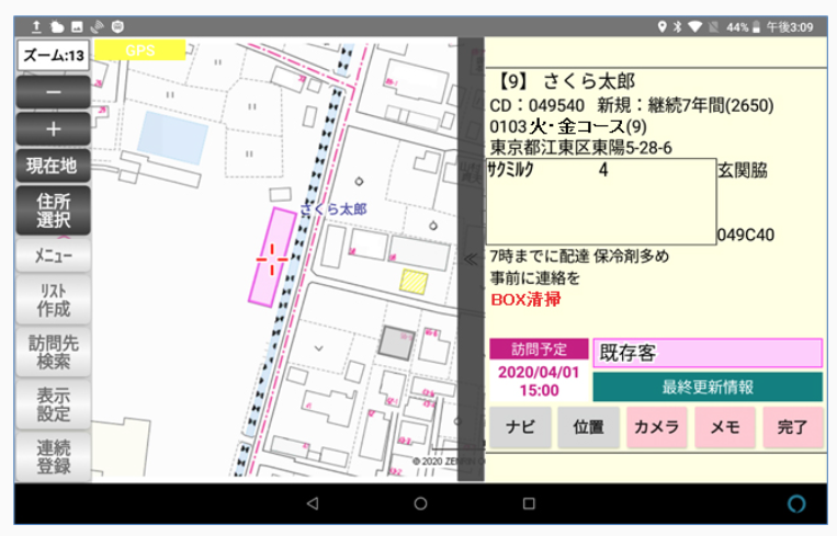 このシステムは、当日の宅配予定表と連携した顧客リストがタブレットのゼンリン住宅地図上に表示され、GPS機能を使った「現在地機能」で住宅地図上の「現在地」がすぐにわかります。配達表やピッキングリストの印刷が不要で、ペーパーレス化を実現します。