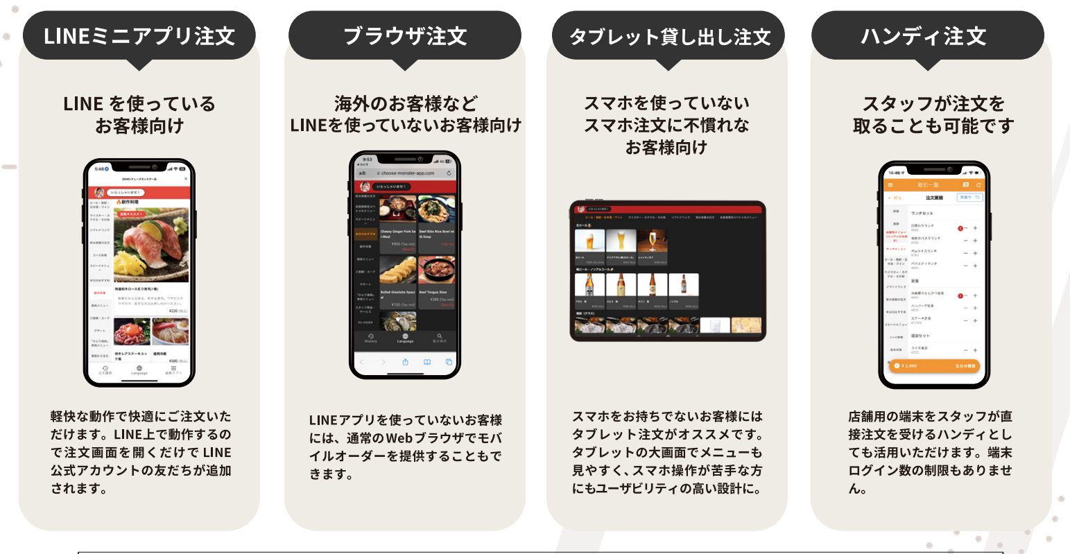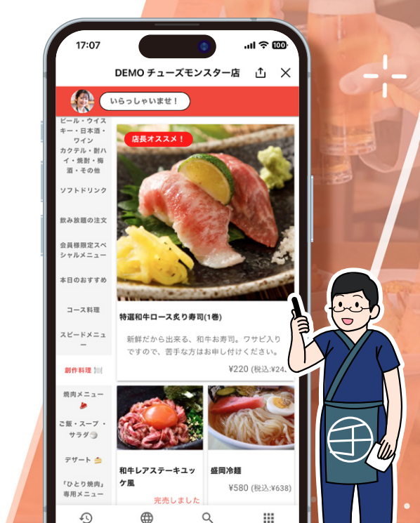 QRコードを読み込むだけでOK!お客様のスマホでサクサク注文でき、スタッフはおもてなしに集中できます。