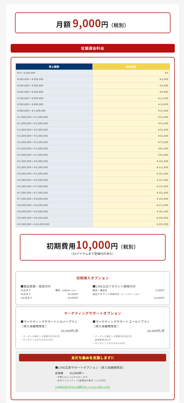 月額9,000円(税別)からの従量課金制。初期費用10,000円(税別)。