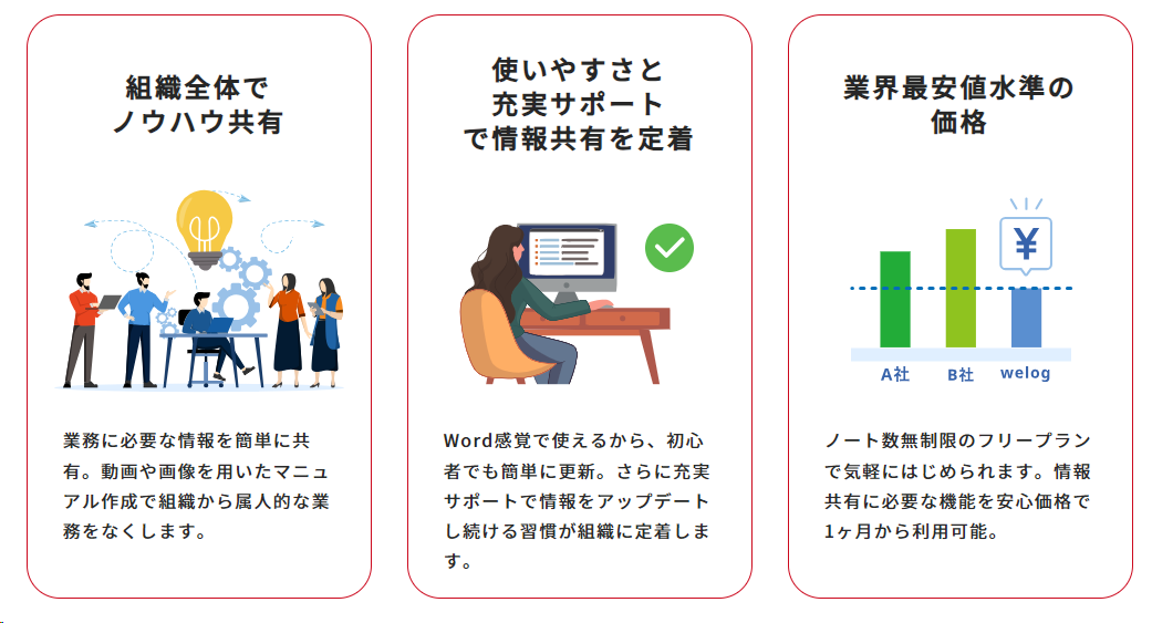 welog(ウィーログ)は、メンバーのノウハウやナレッジを見える化することで組織の属人化問題を解決する情報共有ツールです。社内Wikiの構築やマニュアル、議事録、日報など、誰でも簡単に作成・共有できます。初期費用、月額費用が無料のフリープランで気軽にはじめることができます。