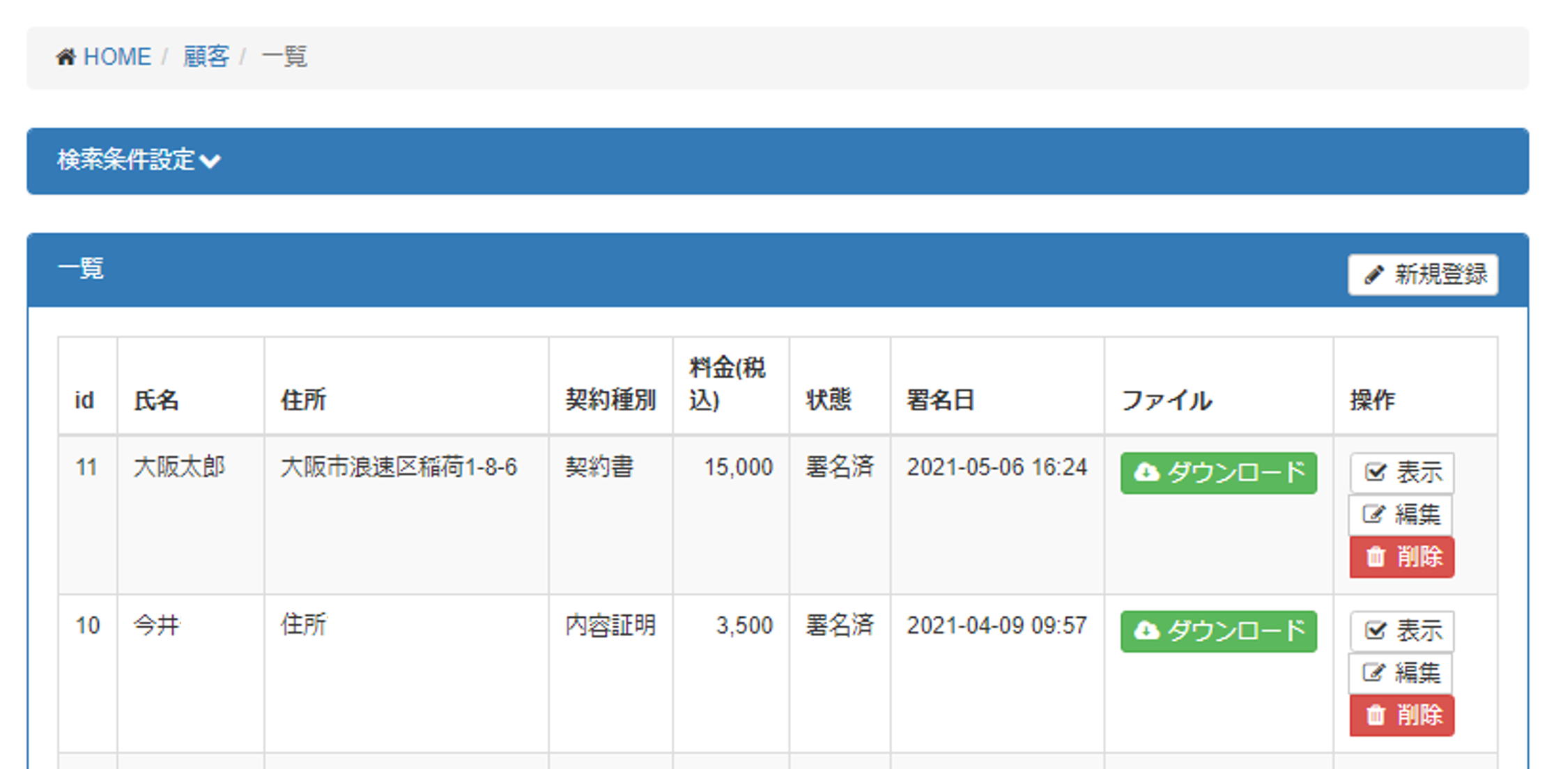顧客ごとに署名状態や署名日などを管理でき、署名済みファイルのダウンロードも自由に行えます。