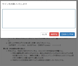 管理画面にて、契約書内にインクルードする顧客名などをあらかじめ設定します。 その後、発行されるURLを顧客へ送ります。 顧客は届いたURLを開くと、契約書や同意書が表示され、確認の後署名をする事が出来ます。 管理画面にて、契約書内にインクルードする顧客名などをあらかじめ設定します。 その後、発行されるURLを顧客へ送ります。 顧客は届いたURLを開くと、契約書や同意書が表示され、確認の後署名をする事が出来ます。