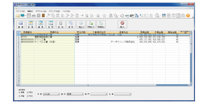 見積WINGは、建築・設備・土木など建設業全般に対応可能な営業支援及び見積・予算作成パッケージソフトです。テンプレートを利用して手軽に機能性に優れた見積もりが作成でき、特に建築業において広く活用されています。見積書をリストで管理し、年度毎や担当者毎でまとめたり、受注・失注・保留などの履歴を追跡し営業面のサポートも行います。見積明細は自由にページ作成が可能で、検索・計算式・小計などの操作が簡単に行えます。見積書だけでなく、請求書・予算書から書類送付状、FAX送付状なども発行可能で、事務作業の軽減に繋がります。