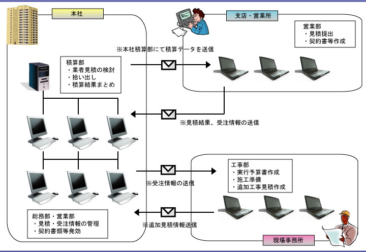 ネットワーク上でデータを共有したり、メールでデータのやり取りを行うことができ、全社でのデータ共有化により業務効率化を図れます。