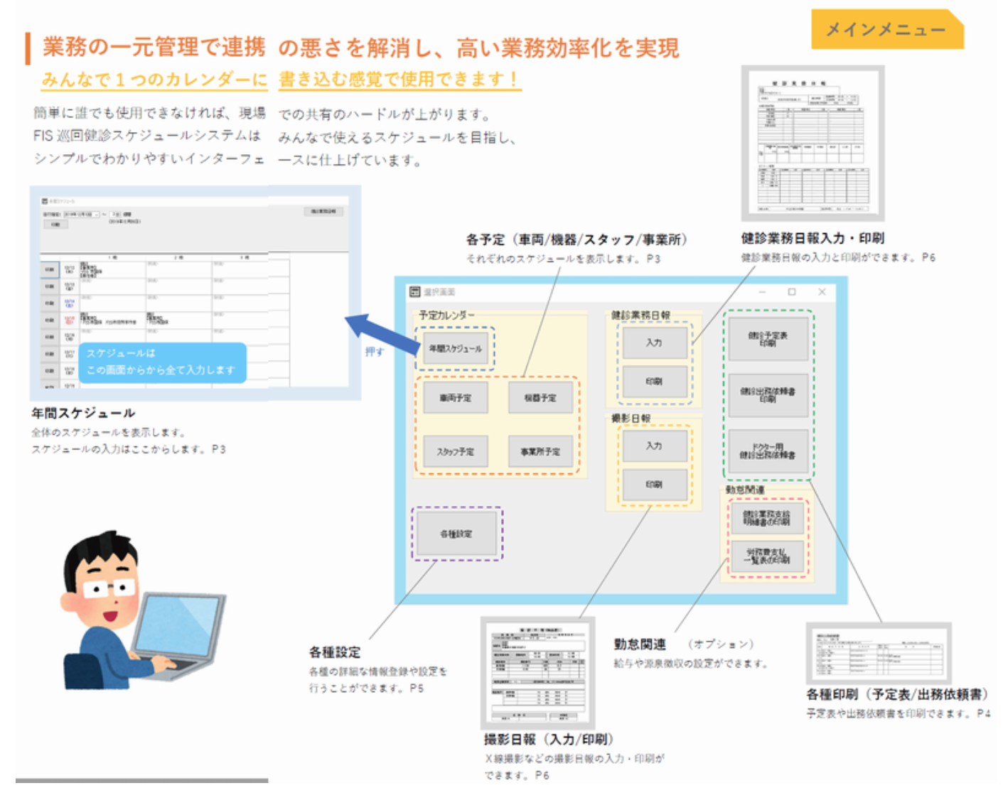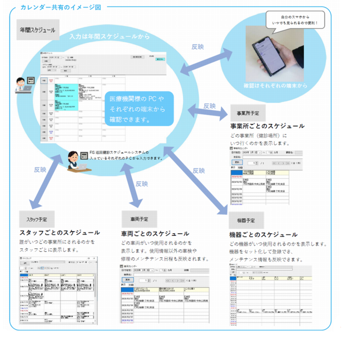通常の社員管理ソフトではできない、健診現場やスタッフの管理、検診車や健診機器の管理を、健診のスケジュールと連携させて一元管理できるシステムです。特に繁忙期など複数班で稼働している場合のスタッフや検診車・機材の出入り管理をスマートかつ確実に行うことができます。最新の情報をリアルタイムで把握でき、PC、スマホから健診のスケジュールや様々な情報を確認できます。パートスタッフへの連絡も一斉メールで行うことができ、メール受信者がシステムにアクセスし、スケジュールを確認したかのチェックも可能です。車両情報には検査満了日や次回の点検予定を、機材情報には機材の購入日や保証期間も登録でき、車両や機材の不備を未然に防ぐことができます。全体のスケジュールや日別のスケジュール、健診日報は紙面に印刷もでき、医師を含むスタッフの勤務時間や交通費も記録でき、後の給与計算の手間も大幅に削減します。