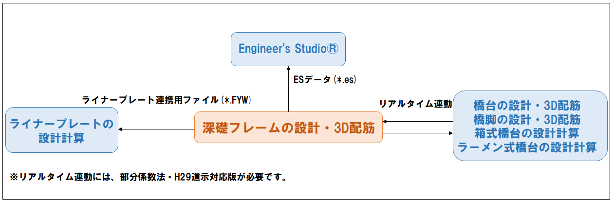 深礎フレームの設計・3D配筋は、斜面上の組杭深礎基礎、柱状体深礎基礎及びフーチングの設計計算と図面作成が可能なソフトウェアです。最新のVer.4では、部分係数法・H29道示に対応し、杭本体及びフーチング部材の耐荷性能照査及び耐久性能照査が可能です。また、CAD機能による3D配筋表示を含む、杭本体及び底版の設計が可能で、橋台、橋脚などの下部工とリアルタイム連動し、荷重や柱・フーチング形状を連動することができます。図面作成では、一般図から配筋図、組立図、加工図、鉄筋表などの図面を一括生成し、簡易編集、SXF、DXF、DWGなどの2次元図面出力及び3D配筋生成機能による3Dモデル出力が可能です。