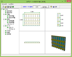 水門ゲートの設計計算は、中・小形ゲートを対象として、鋼製・FRP製ゲートの扉体・戸当りの設計を行うプログラムです。ゲート形式は、ローラゲート、スライドゲートに対応しており、扉体の設計では桁断面の照査、スキンプレートの照査に対応します。ローラゲートでは、主ローラ、サイドローラ、戸当り部の照査に対応し、スライドゲートでは、戸当り部コンクリート支圧応力度、せん断応力度照査に対応します。材質は鋼製、FRP製ゲートに対応し、スキンプレートの照査は片側のみの静水圧に対応します。桁部材の断面形状は溝形鋼、H形鋼、L形鋼、T形鋼に対応し、ローラレール、受桁の断面形状はH形鋼のみ対応します。