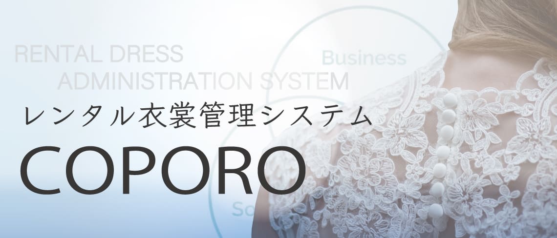 COPOROは、レンタル衣裳管理システムで、貸衣裳業務に特化したパッケージソフトです。スケジュール管理、貸衣裳の商品管理、売上や業者間リベートの単品管理、新郎新婦・親御様の細かな衣裳単位請求の管理など、貸衣裳管理業務に必要な機能を網羅しています。また、売上や業者間リベートを単品から管理し、新郎新婦・親御様の細かな衣裳単位請求も請求先グループ毎に管理できるなど、貸衣裳管理業務にぴったりのソフト・システムです。