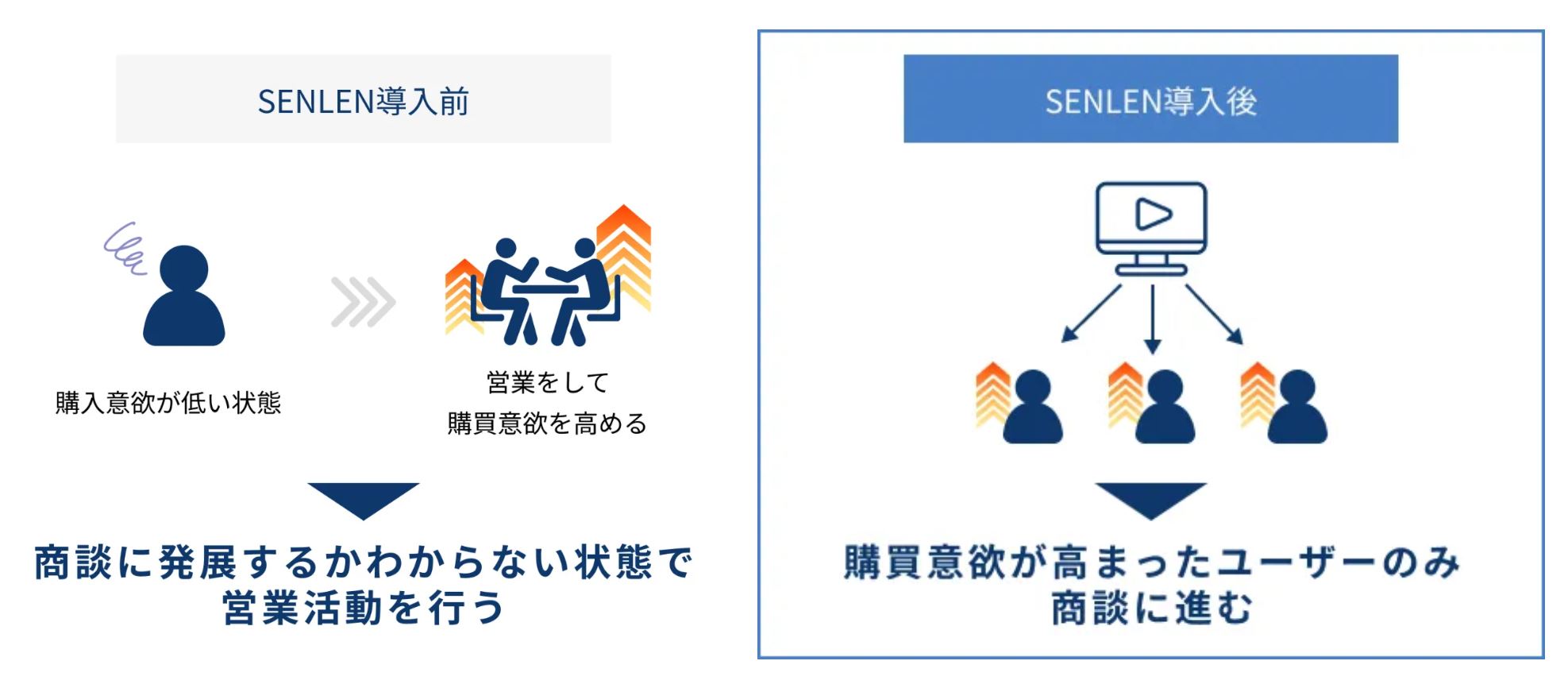 SENLENを導入することで動画によるナーチャリングが可能となり深夜・土日関係なくリード顧客へ対面営業と同様の体験を提供することができます。