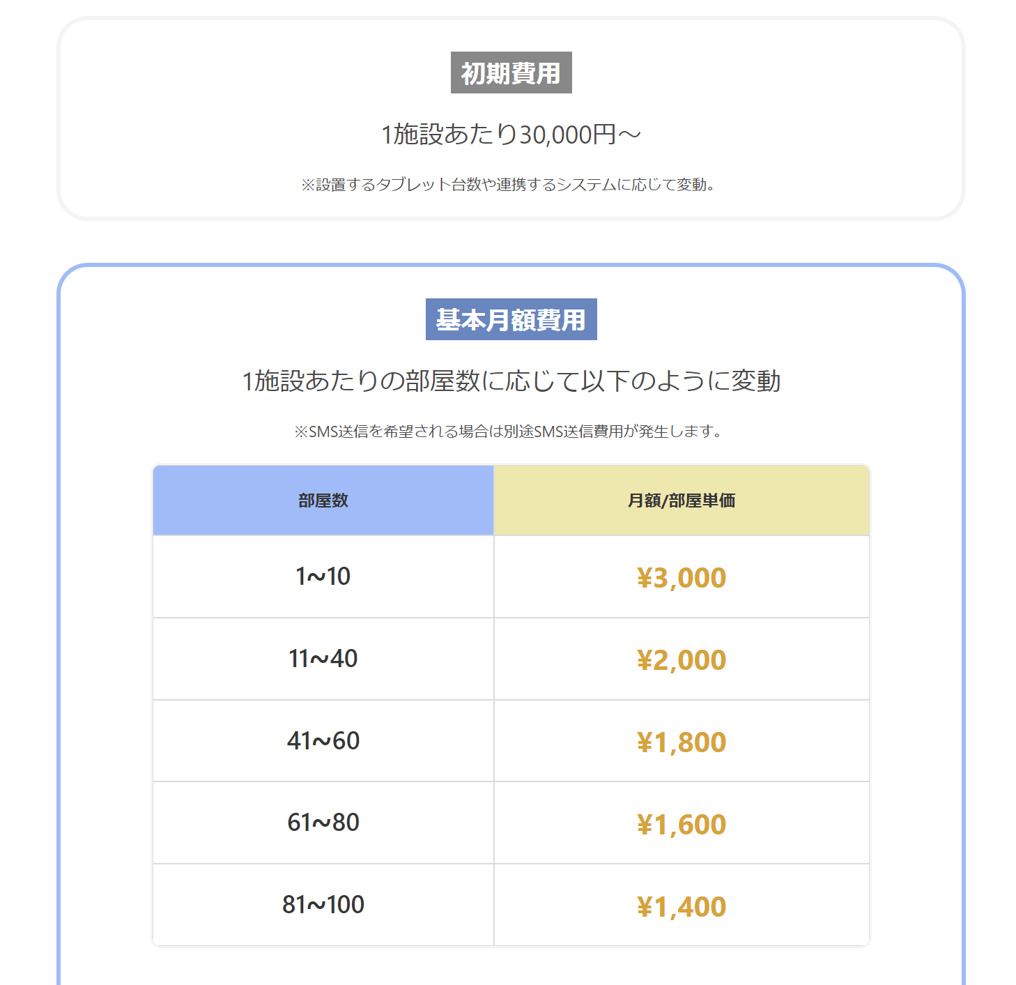 初期費用1施設あたり30,000円〜、基本月額費用部屋数に応じて変動