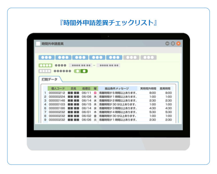 時間外申請時間と実際の勤務時間の差を抽出し、適正な申請が行われているかを簡単にチェックします。