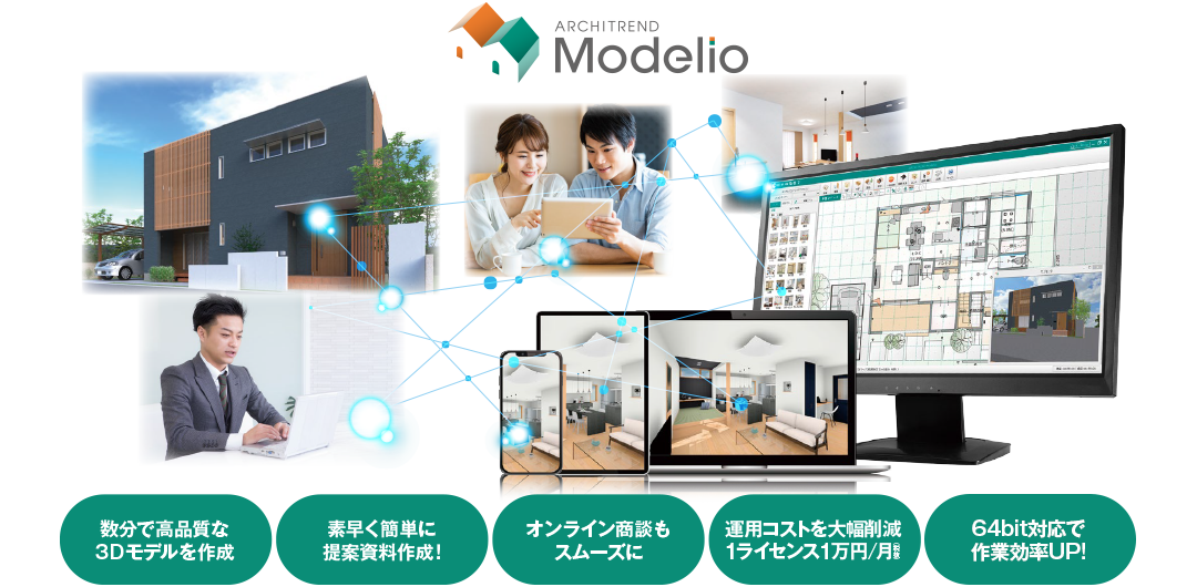 ARCHITREND Modelioは住宅プランの入力~高品質パース・プレゼンボードからVR体験まで、初期提案・仕様打合せに必要な資料を簡単に素早く作成できるプレゼンソフトです。1ライセンス月額11,000円~のリーズナブルな価格設定で運用コストを削減可能です。
