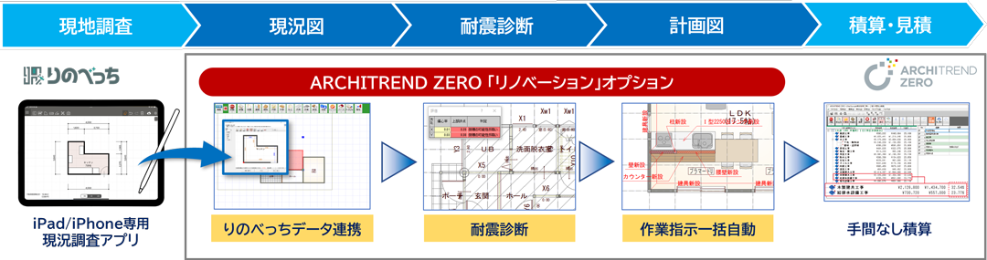 ARCHITREND ZEROは新築だけでなくリフォーム・リノベーションのプラン設計に適した入力ステージをご用意。現地調査から現況図・計画図、パースの作成、耐震診断、積算見積までプランデータがシームレスに連携し、リノベーション業務を一括サポートします。現況調査アプリ「りのべっち」との連携、iPad/iPhone専用 リノベーション現況調査アプリ「りのべっち」のデータをクラウド経由でARCHITREND ZEROにシームレスに連携。調査データの共有でプラン計画を即開始でき、現況図・計画図作成の省力化が図れます。また、ARCHITREND ZEROデータを「りのべっち」に連携することも可能です。